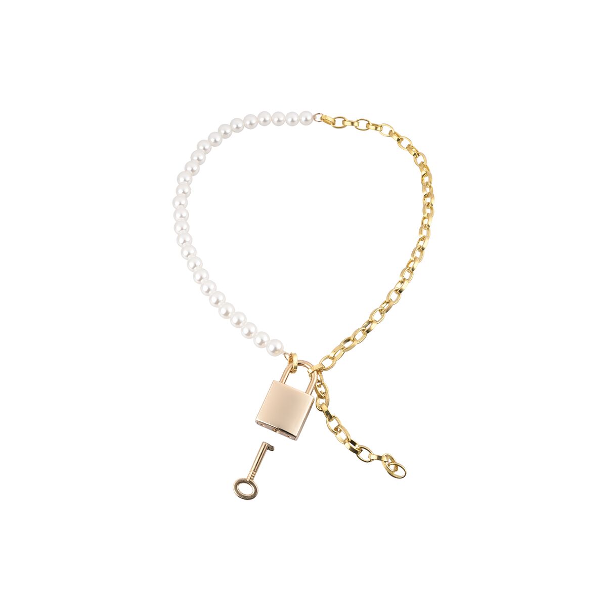 Tuo arvokkuus ja alistuminen samaan lauseeseen tällä Pearl Day Collar -kaulakoru, joka kimaltelee tekohelmien ja kullanvärisen ketjun säihkeessä. Tämä ei ole vain kaulakoru – se on sitoutumisen symboli, jonka kultainen lukko ja avain viestivät, kenelle todella kuulut. Ja kun ilta koittaa, voit kietoa sen ranteeseesi, jatkaen alistumista kuin se olisi koru muiden joukossa.